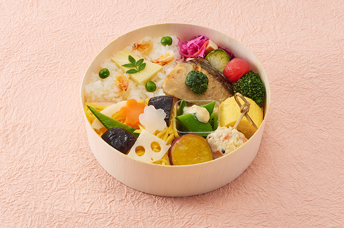 かやく飯、ちらし寿司、梅ご飯の3色ご飯、豆腐入り鶏つくね、まぐろしぐれ煮、野菜入り袱紗焼きの他、新じゃが、ほうれん草のお浸し桜えび添え、三色なます等春の献立を詰め合わせたお弁。