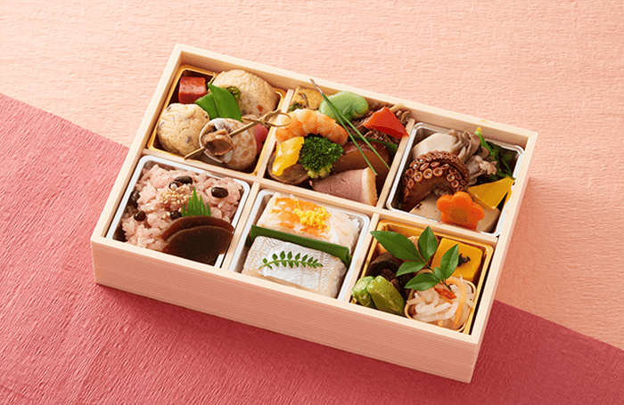 赤飯、海老と鯛の押し寿司、鮑の福良煮など祝肴を彩り豊かに盛り込んだお重です。ご希望の方には名入り祝い熨斗で包装させて頂きます。