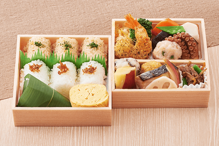 コシヒカリの白御飯と相性の良い袱紗玉子焼きや揚げ物、季節野菜の焚合せなどおかずを充実させた二段弁当です。旬の食材を使った献立となります。