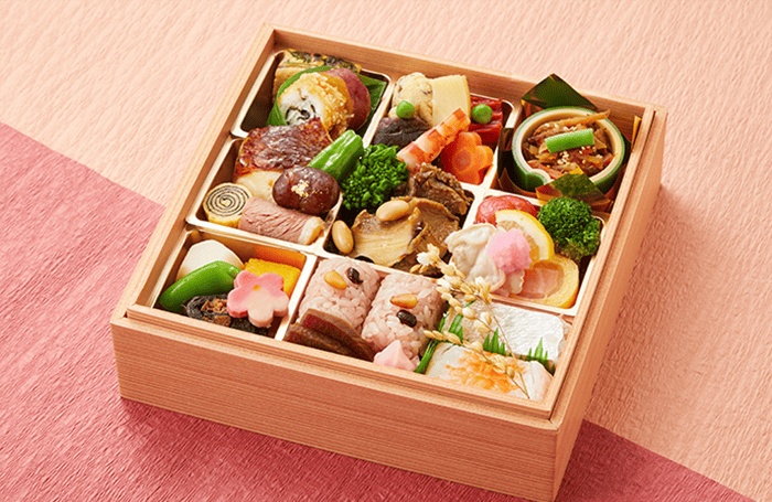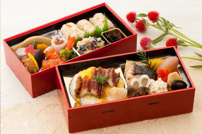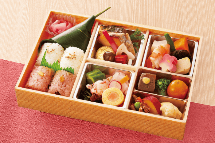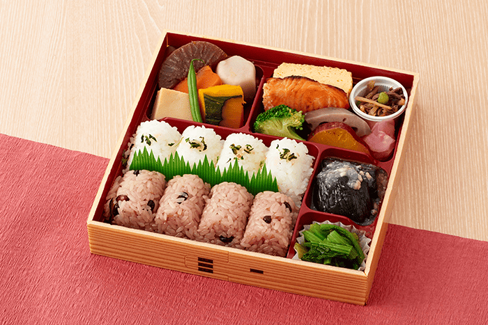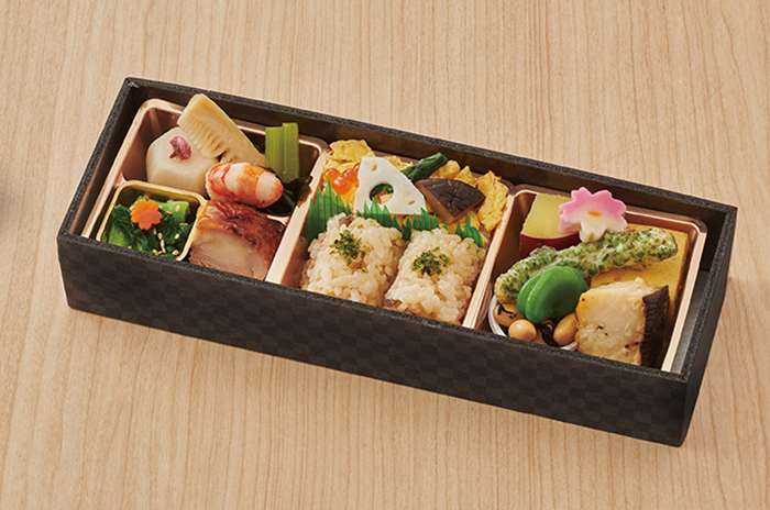 かやく飯、ちらし寿司、梅ご飯の3色ご飯、豆腐入り鶏つくね、まぐろしぐれ煮、野菜入り袱紗焼きの他、新じゃが、ほうれん草のお浸し桜えび添え、三色なます等春の献立を詰め合わせたお弁。