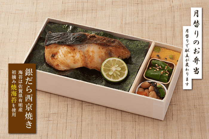 国内産コシヒカリの朝炊き御飯、国内産厳選品の海苔の上に、炭焼きした大きな切り身の銀だら西京焼を盛り付けた特別な海苔弁当です。