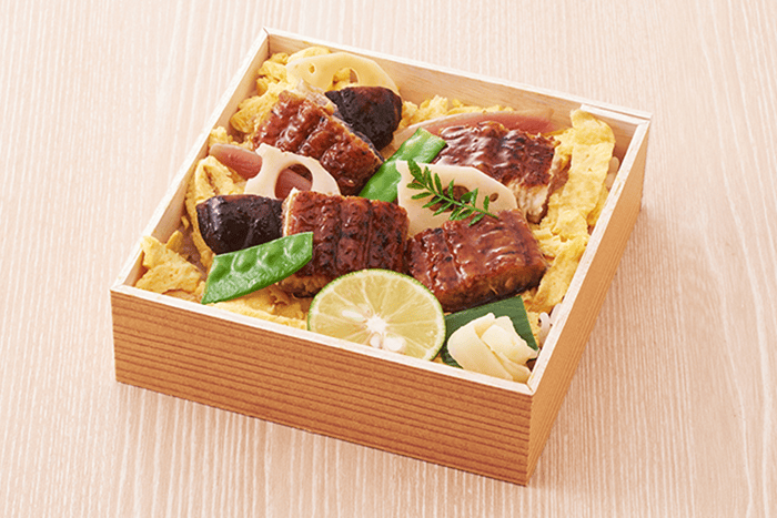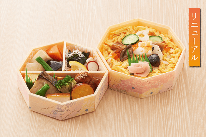 発売から25年の超ロングセラー。名物海老と穴子のちらし寿司。旬魚の西京焼、袱紗玉子焼、鶏甘酢煮、高野豆腐と野菜の炊合せ、しらすの酢物、大判焼き、丸十密煮等。