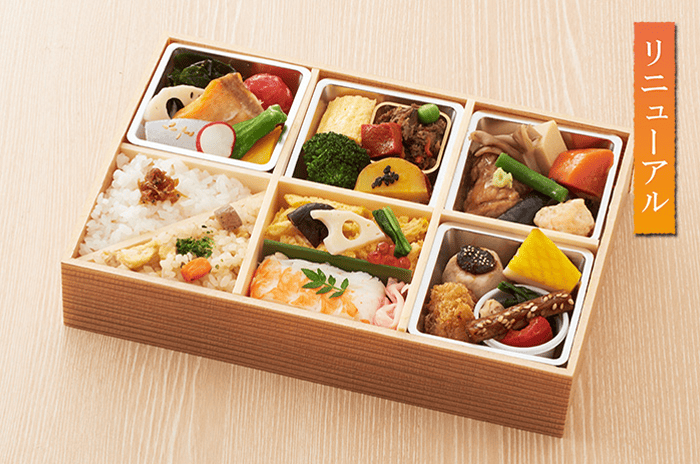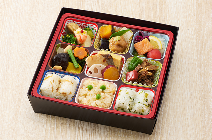 15年以上続くベストセラー。海老ハイカラ揚、旬魚の西京焼、烏賊団子、大根煮、鶏治部煮山葵、小芋・南瓜茄子の鶏そぼろ餡、3種の御飯など。