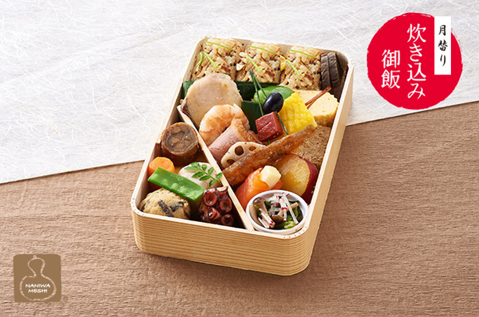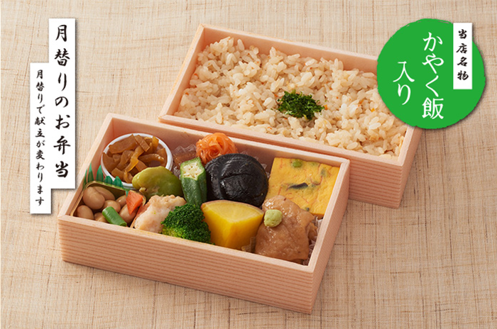 名物かやくご飯をはじめ笹寿司など3種の御飯に季節の食材を彩り豊かに盛り付けた月替わり折詰弁当です。阪急百貨店でも人気の逸品です。