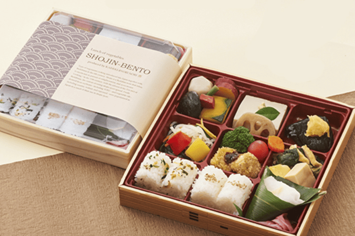 「精進料理」とは元々、修行僧が仏教の戒律に基づき最低限度の栄養を摂取するために食べる料理でした。私どもの「Shojin Bento」は野菜や豆類など植物性の食材のみを使用し、現代的な日本料理の技法を用いてすべての方に美味しく召し上がっていただけますよう調製しています。 「特製の胡麻豆腐」や「季節野菜の煮物」「5色野菜の酢の物」「味付こんにゃくのフライ」「茄子の味噌煮」「高野豆腐」「大根の笹寿司」がスペシャリティーとして入っています。 甘味・辛味・酸味・苦味・旨味の5つの味を調和させた日本古来のヘルシーなお弁当をお召し上がりください。 動物性たんぱく質を使わず、仕上げたヘルシーなお弁当です。外国の方にもお召し上がり頂きやすいよう英文で献立を記載しています。