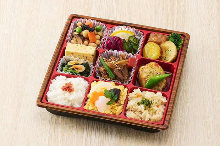 15年以上続くベストセラー。献立の品目を一層充実しました。鶏治部煮、茄子煮、南瓜煮、長芋煮、鮭南蛮漬、酢トマト、胡瓜酢物、ブロッコリー、蒸し海老、椎茸旨煮、清白、大豆煮、隠元、鰆幽庵焼、酢蓮根、丸十密煮、袱紗玉子焼、牛肉と牛蒡のしぐれ煮、八幡蒟蒻、ちりめん御飯、かやく御飯、青菜飯など